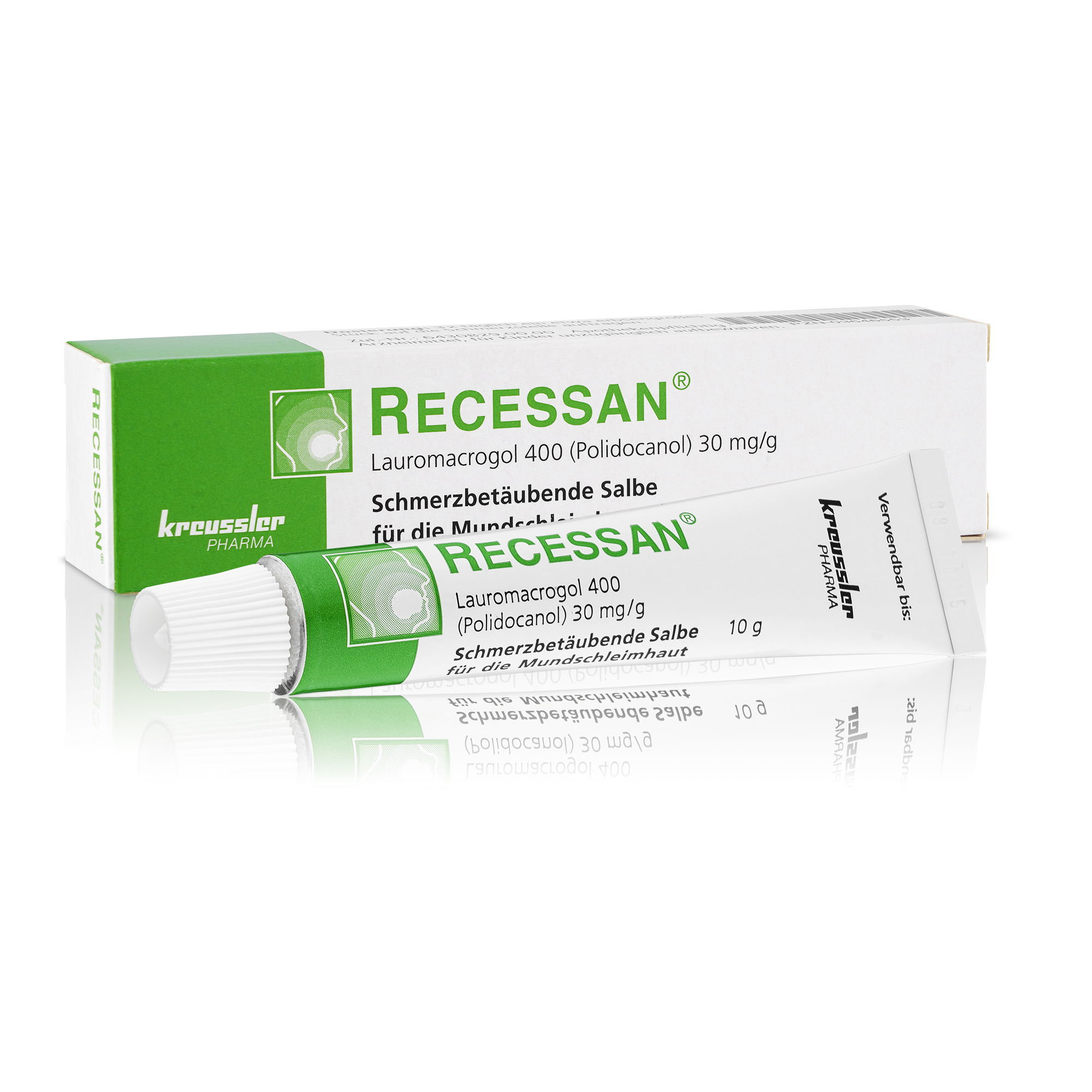 RECESSAN®. Wirkstoff: Lauromacrogol 400 (Polidocanol) Anwendungsgebiete: Zur zeitweiligen, symptomatischen Behandlung von schmerzhaften entzündlichen Erkrankungen an Zahnfleisch und Mundschleimhaut. Hinweis: Zu Risiken und Nebenwirkungen lesen Sie die Packungsbeilage und fragen Sie Ihre Ärztin, Ihren Arzt oder in Ihrer Apotheke. Stand: Juli 2023. Chemische Fabrik Kreussler & Co. GmbH, D-65203 Wiesbaden www.kreussler.com.